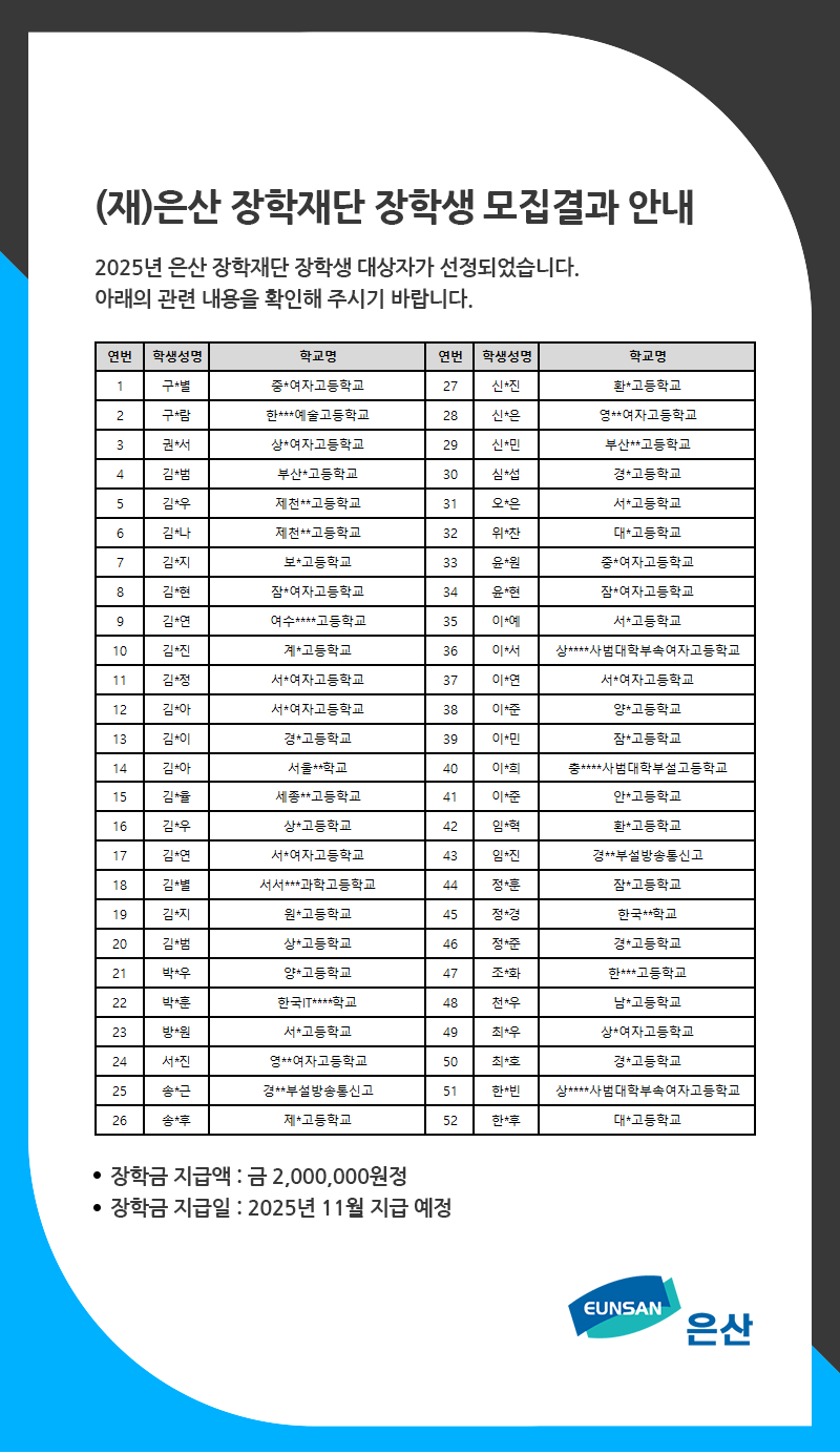 (재)은산 장학재단 2025년 장학생 모집 결과 안내